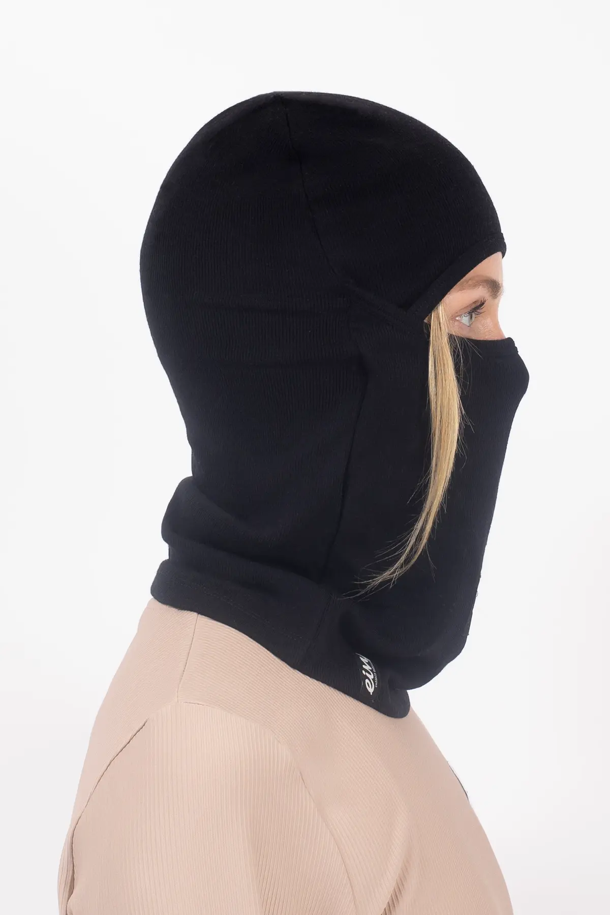 Black ribbed Hinge Balaclava in soft, non-itchy merino wool for full coverage and natural temperature regulation in cold weather. The face-hugging fit stays securely in place under your helmet and goggles, while the vertical front seam eliminates pressure points on the forehead – ideal for long days on the mountain. Thanks to its naturally antibacterial and moisture-wicking properties, merino wool is also a go-to choice for those with sensitive or easily irritated skin. A soft and functional layer in your winter gear setup.