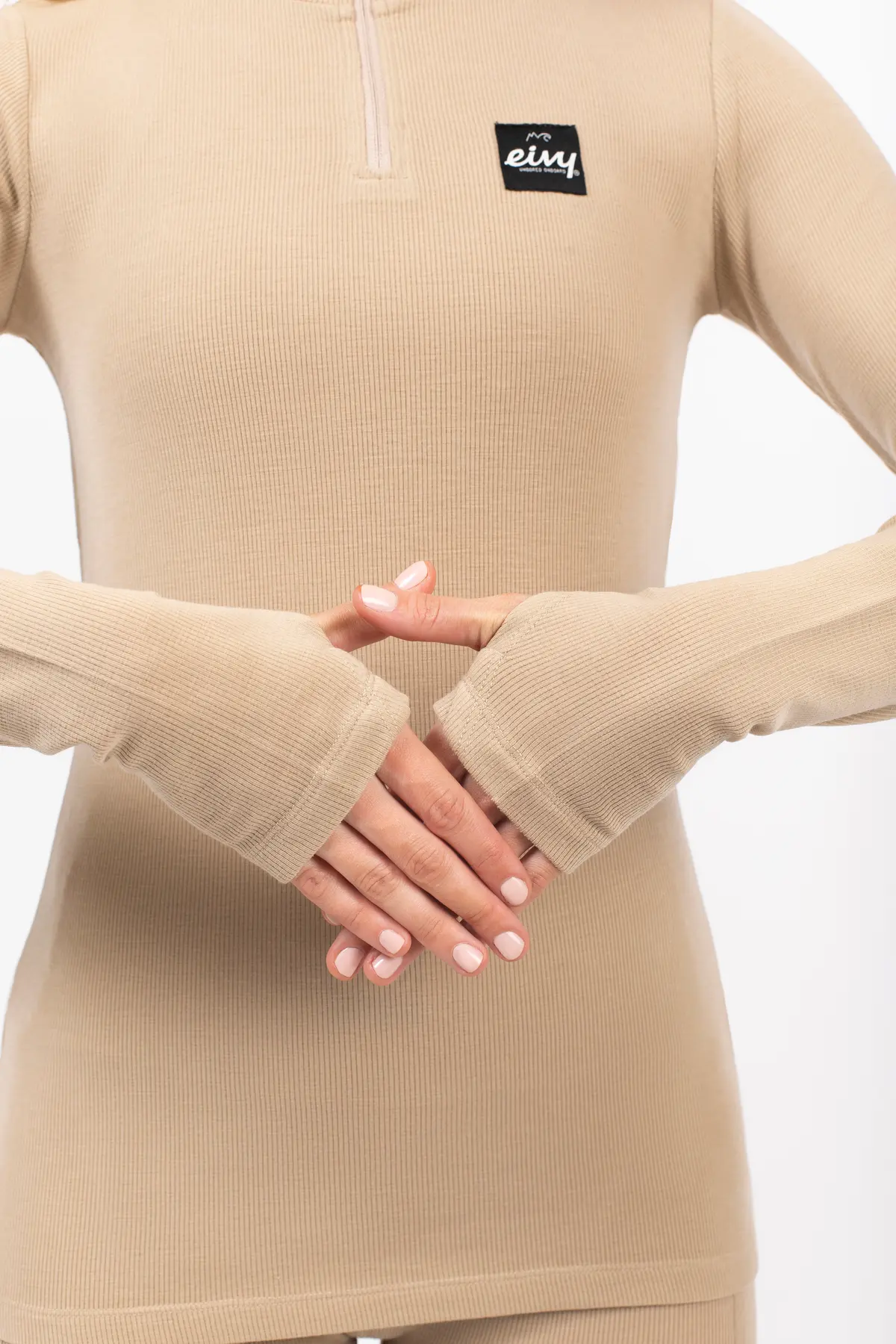 Our beige Journey Merino Wool model is a merino wool base layer crafted in a snug, body-hugging fit with a shorter zipped collar. Ideal for the slopes, après-ski, running, and everyday wear – its merino wool construction provides natural insulation and breathability.