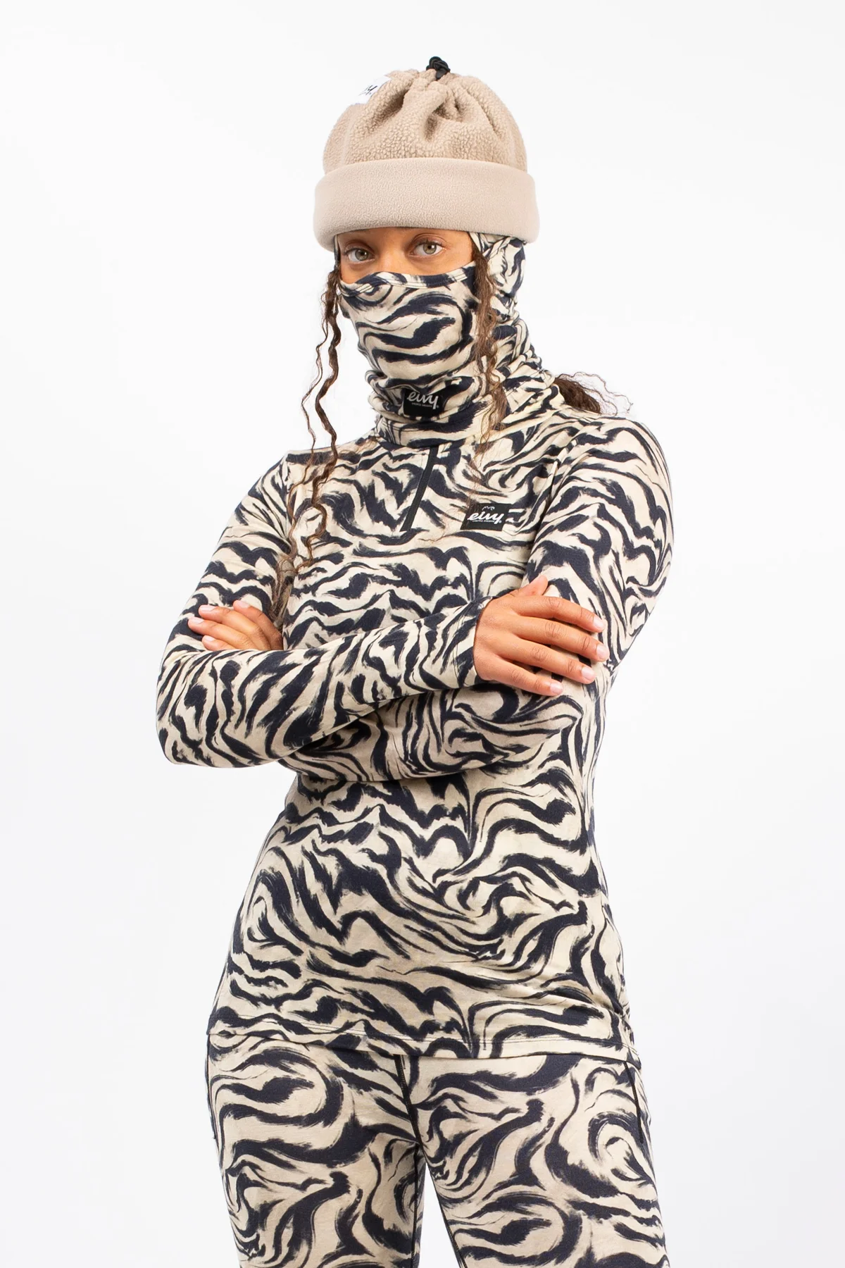 Our animal printed Journey Merino Wool model is a merino wool base layer crafted in a snug, body-hugging fit with a shorter zipped collar. Ideal for the slopes, après-ski, running, and everyday wear – its merino wool construction provides natural insulation and breathability.