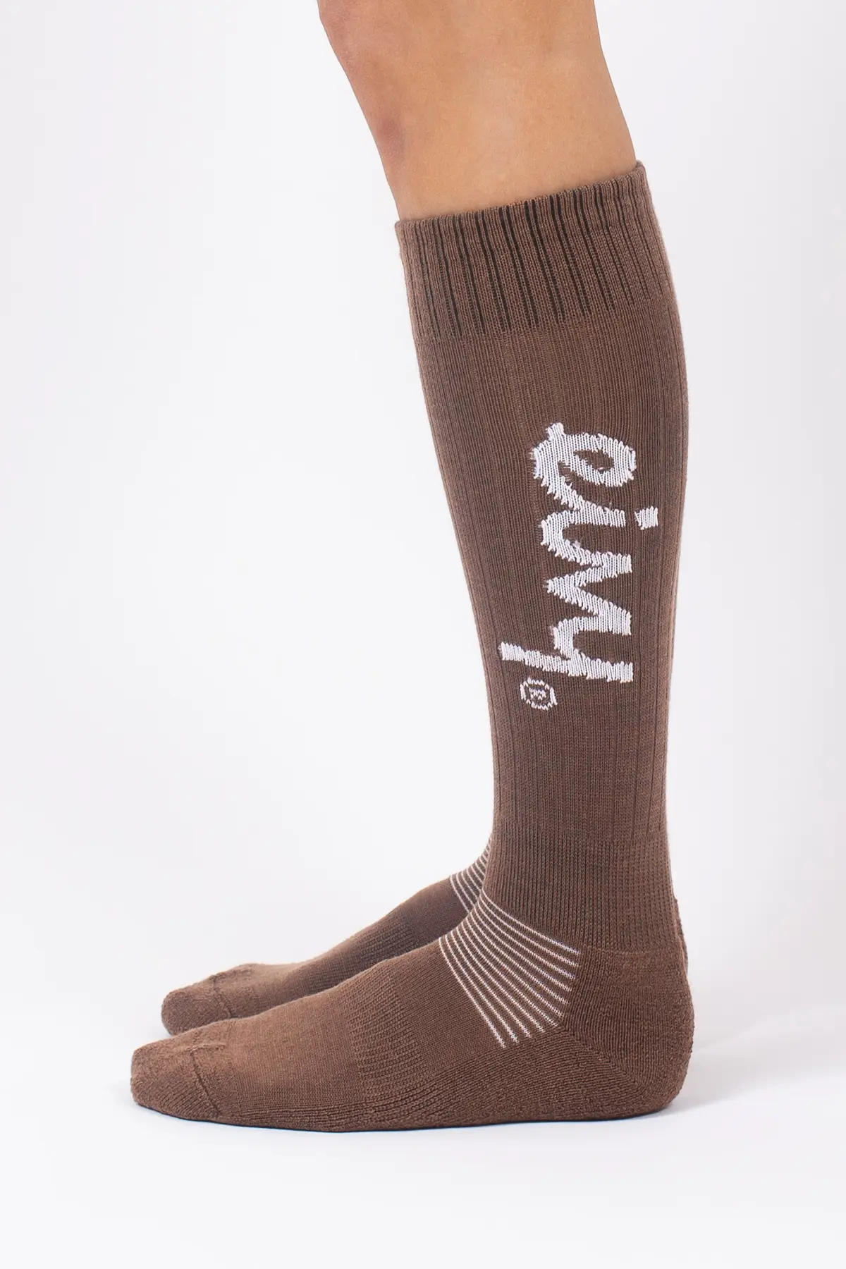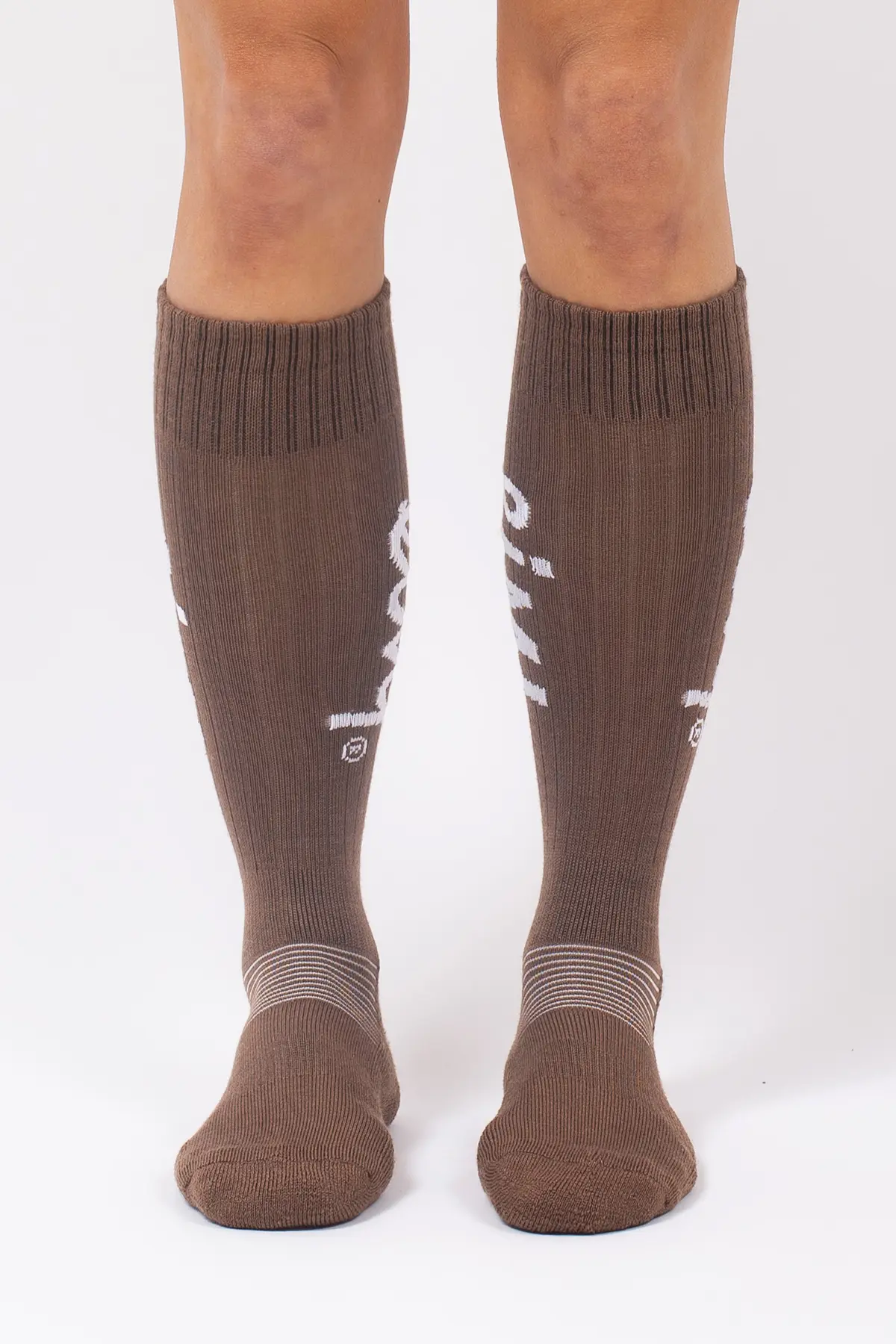 Ribbed brown sock perfect whether you are on skis or snowboard. The design is loaded with tech to stop you from freezing in any condition, the Rib Wool socks can go from the mountain to the club and back. Padded footbed and toe pocket, ankle flex zone and ribbed grip zones. Woven patch detailing and merino wool blend for warmth and durability.