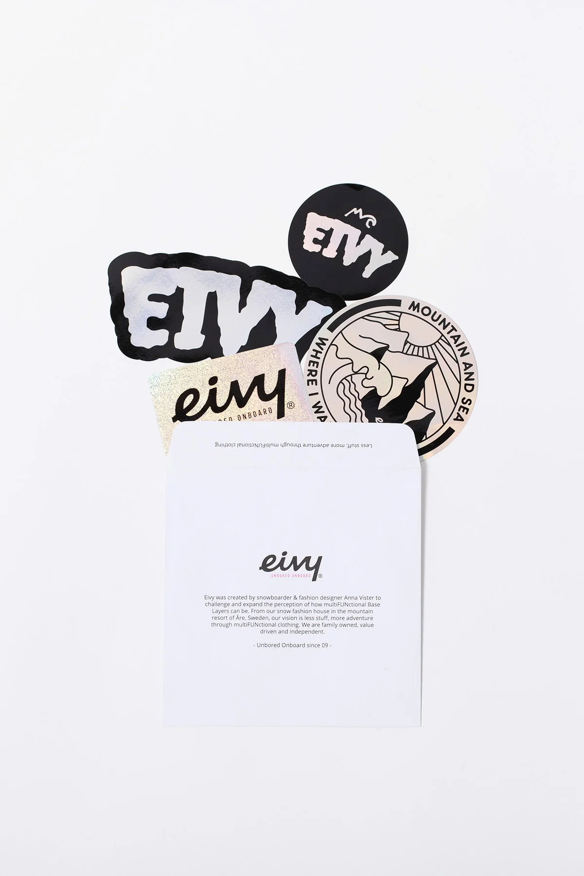Holographic shiny Eivy stickers to pimp your snowboard, skis, laptop, phone case, water bottle, skateboard…or your walls. Spread the word and stay #unboredonboard.