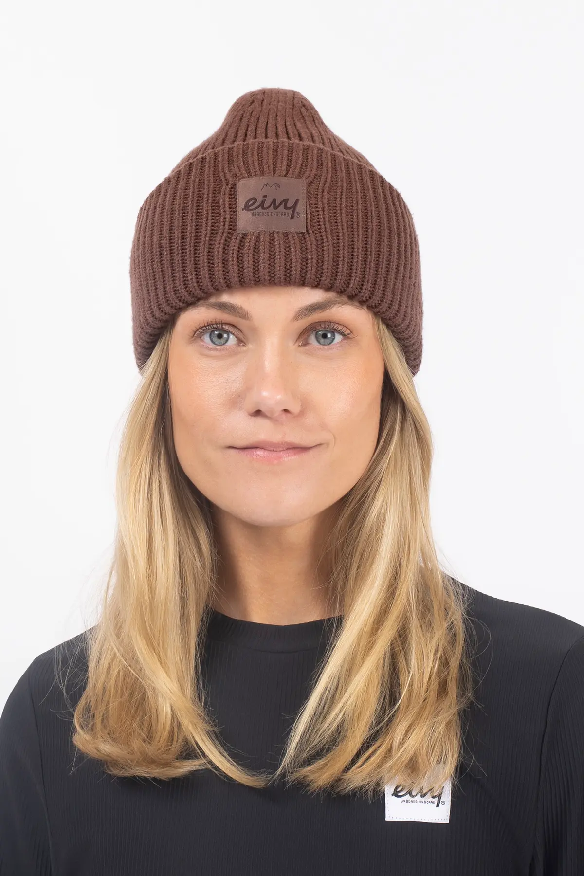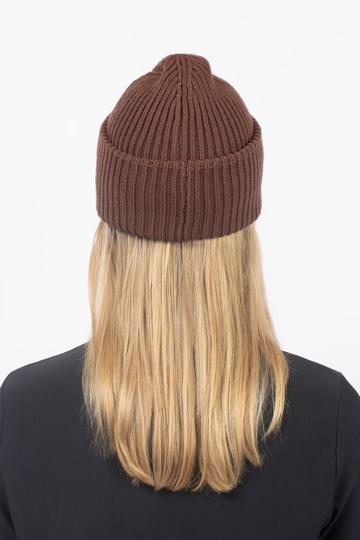 A thick woven brown jacquard beanie with a folded edge and soft structure for everyday warmth. The front logo patch is tone-on-tone, blending seamlessly with the beanie for a clean, monochrome finish.