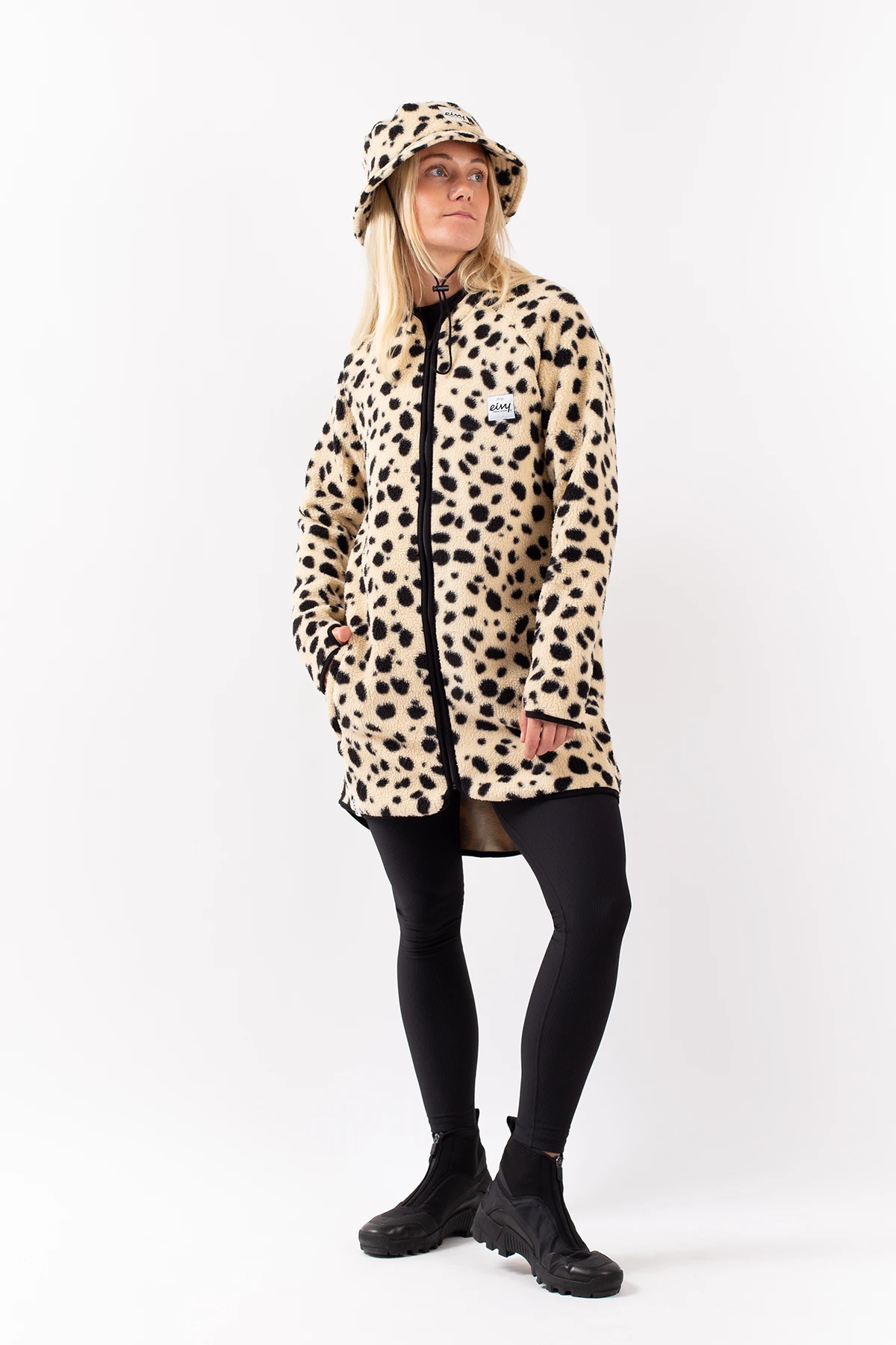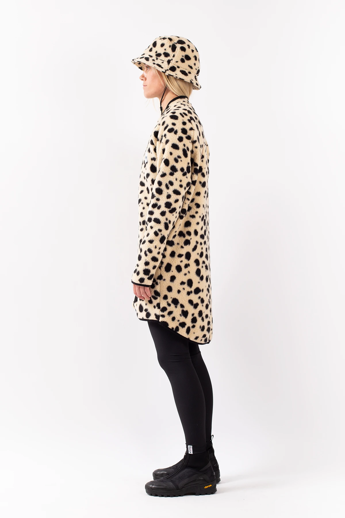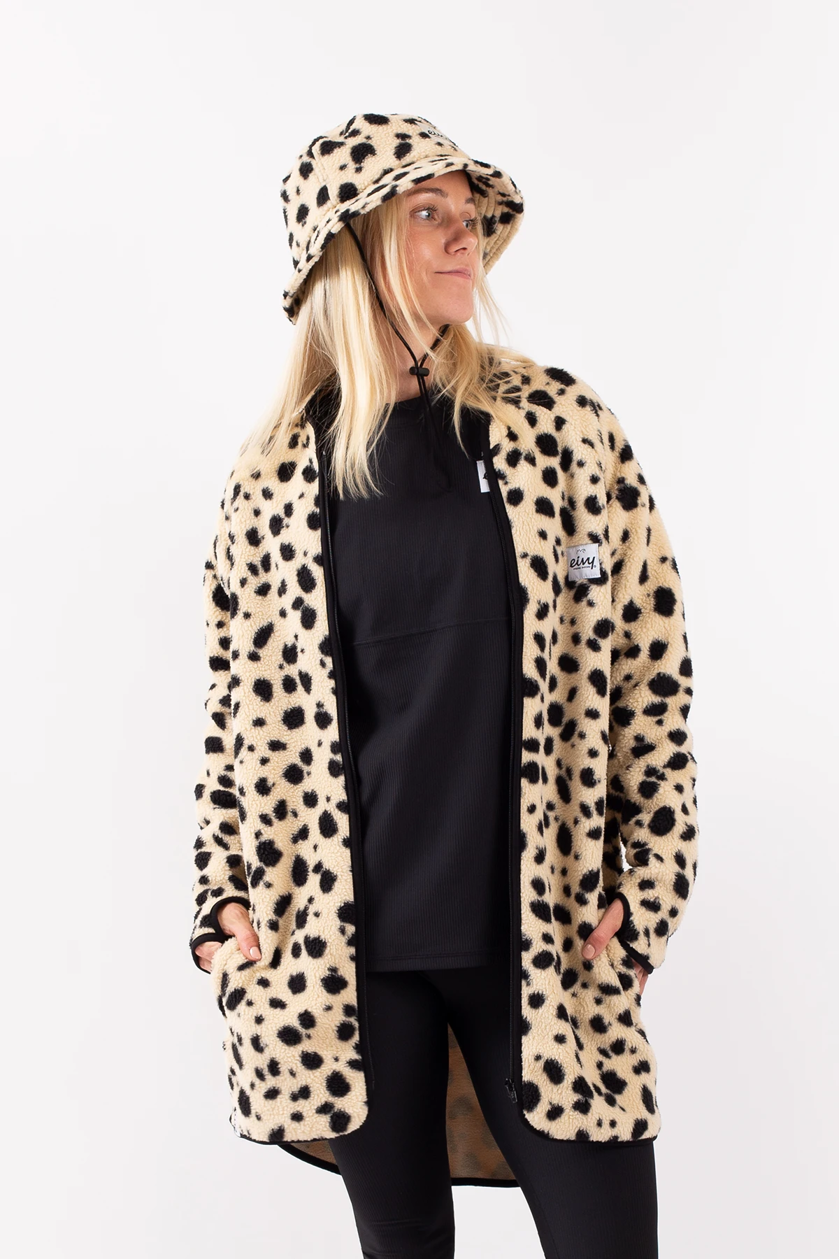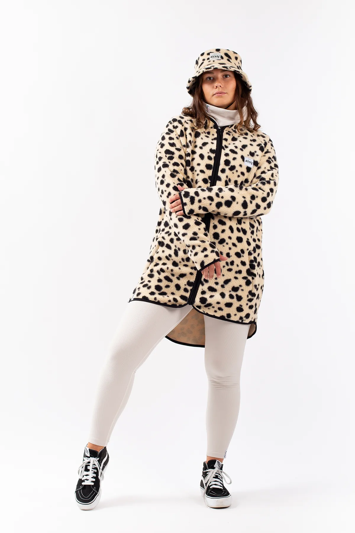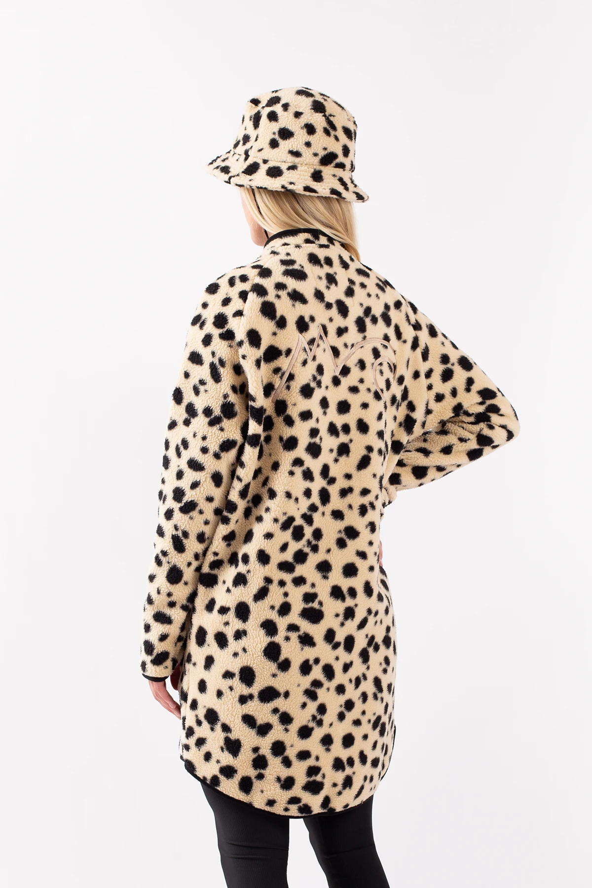 Eine längere Fleecejacke in Beige, im dickem und weichem Sherpa-Vlies, Schultern im „Raglanschnitt“, Stickereien am Rücken und überlanger Schnitt für einen coolen Style. asst genauso gut als zweite Schicht im Winter wie als Mantel im Herbst und Frühling.