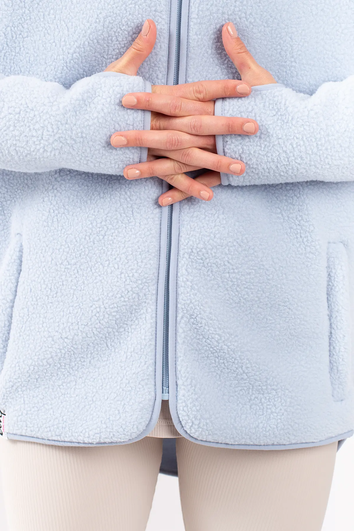 Eine Fleecejacke mit intergrierten Daumenschlaufen im dickem und weichem Sherpa-Vlies, YKK®-Reißverschlüsse vorne und an den Taschen, abgeschrägte Schultern und verlängertes rückenende. Perfekt als Jacke für den Frühling oder den Herbst, eignet sich aber auch als zweite Schicht an kalten Wintertagen auf deinem Snowboard oder Skiern.
