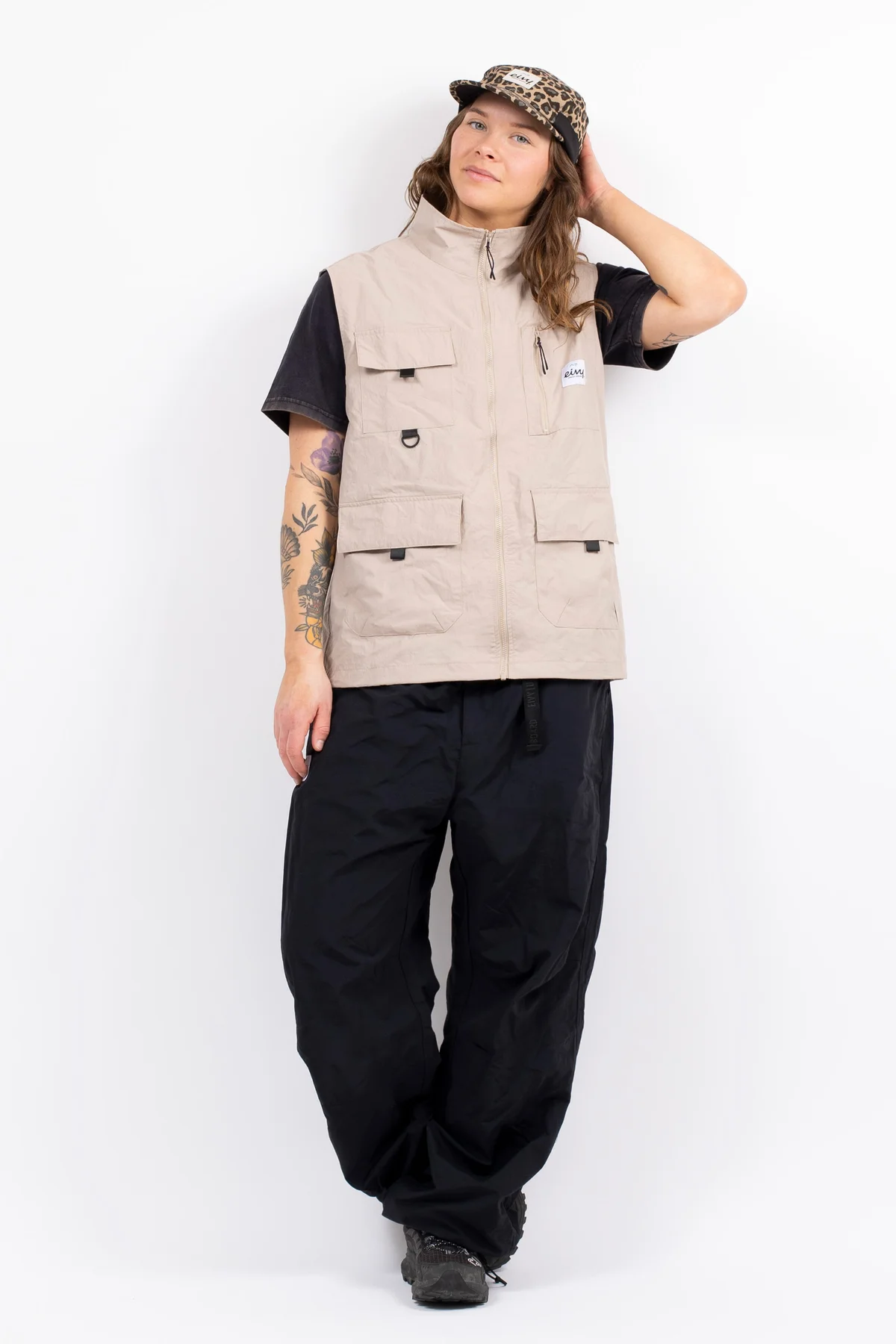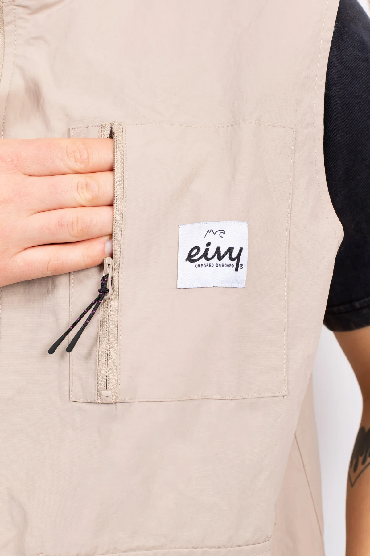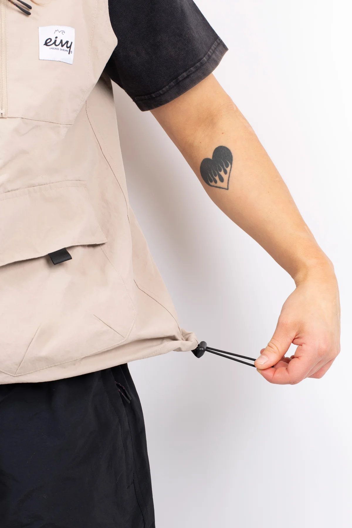 Beige outdoorväst i något oversized passform med vindavvisande funktion och smarta detaljer som meshfoder på insidan. Designad med hög krage för extra skydd, säkrade fickor med dragkedja eller knappar för dina essentials, och en vävd Eivy-patch som ger det där signatur utseendet. Den justerbara dragskon i fållen gör att du kan bära västen rak eller instoppad för en mer figurnära look. Perfekt som ett stilrent lager över en hoodie eller underställ för vardagsäventyr eller vandring.