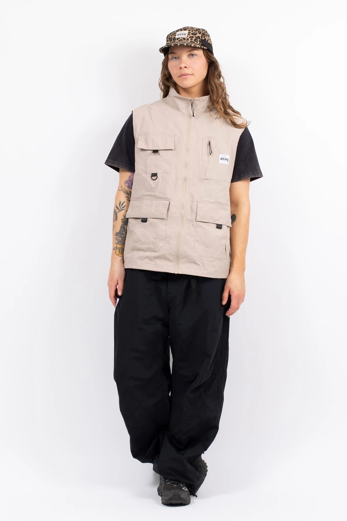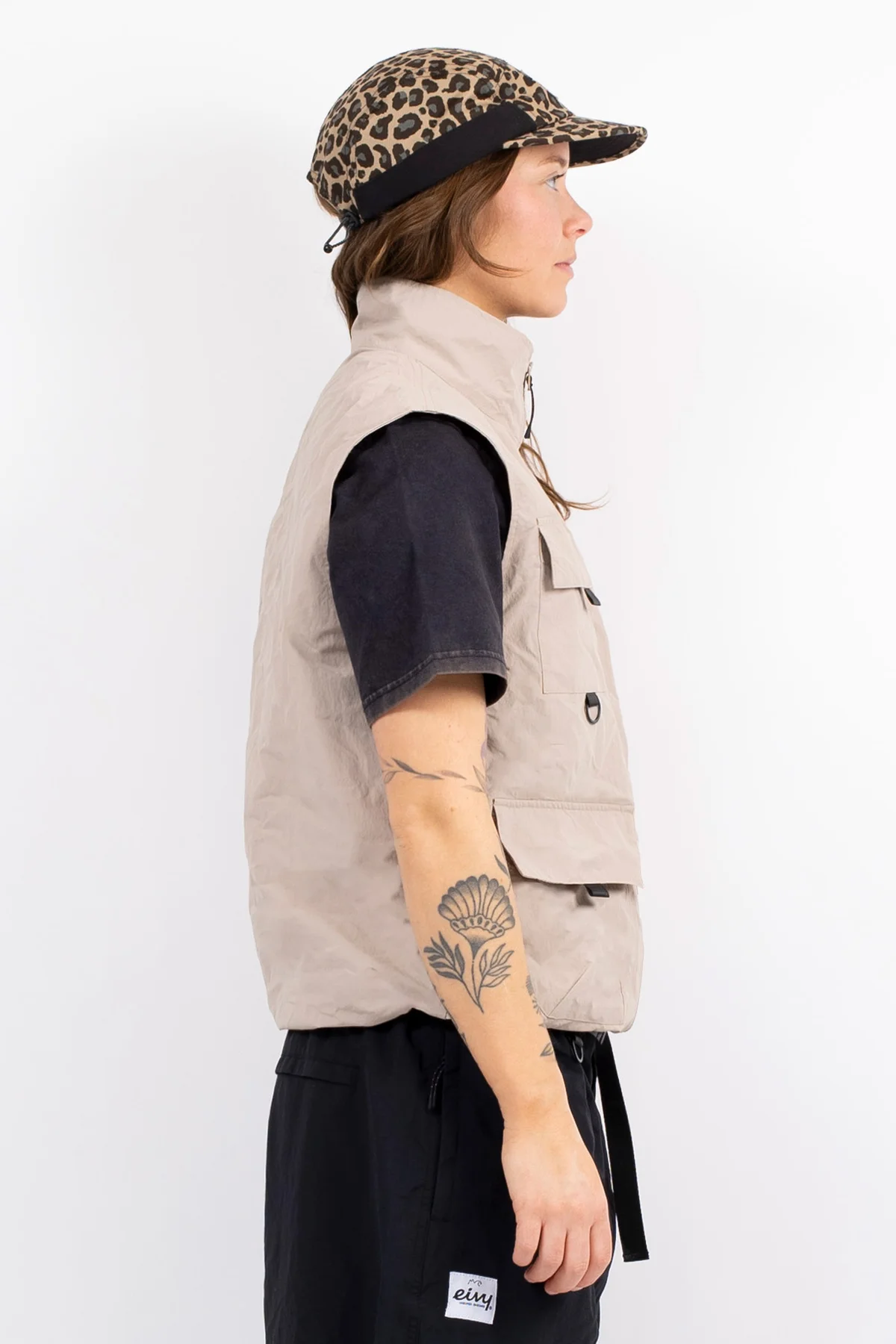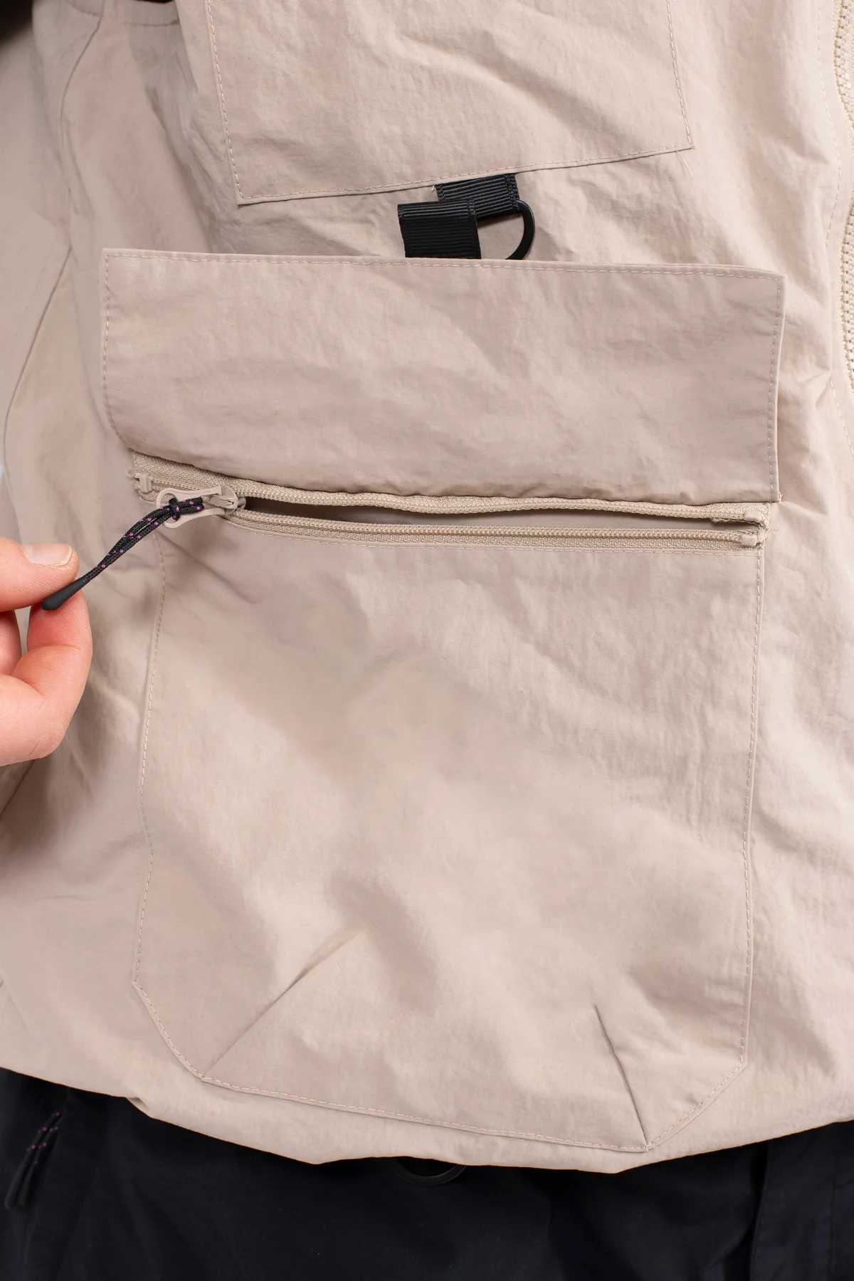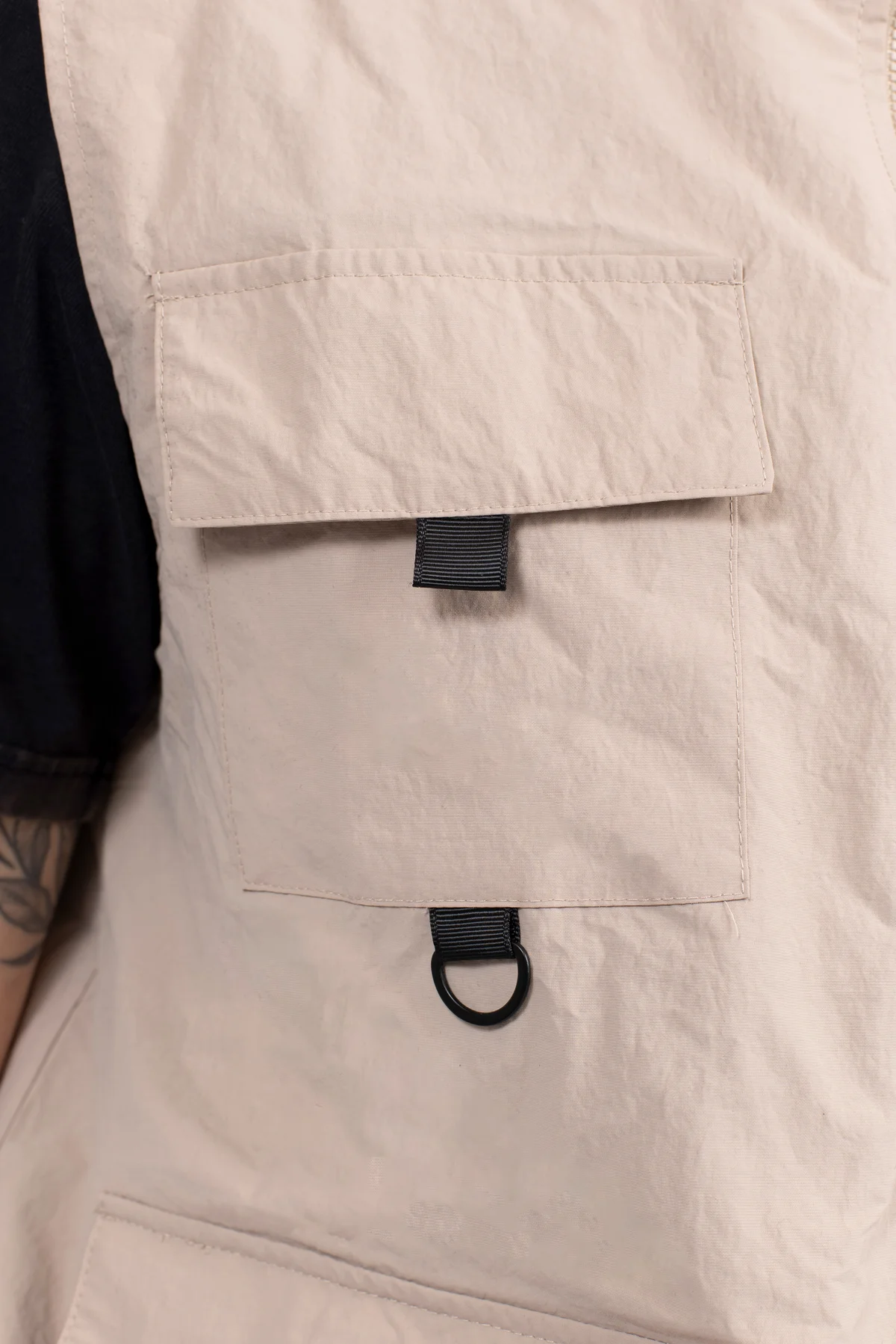 Beige outdoorväst i något oversized passform med vindavvisande funktion och smarta detaljer som meshfoder på insidan. Designad med hög krage för extra skydd, säkrade fickor med dragkedja eller knappar för dina essentials, och en vävd Eivy-patch som ger det där signatur utseendet. Den justerbara dragskon i fållen gör att du kan bära västen rak eller instoppad för en mer figurnära look. Perfekt som ett stilrent lager över en hoodie eller underställ för vardagsäventyr eller vandring.