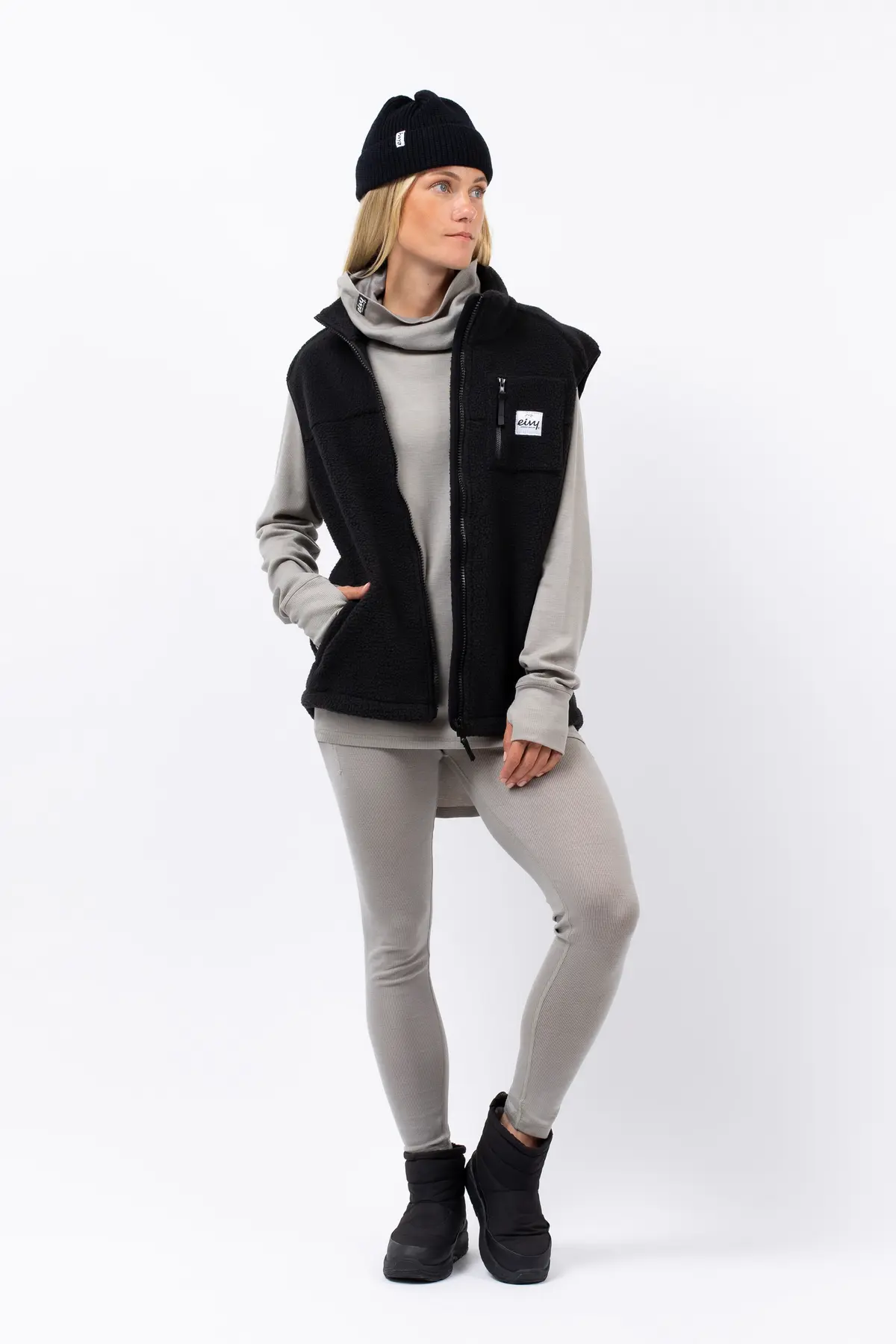 Stay extra cozy and warm in our green merino wool base layer top, which merges fashion with ultimate functionality. Made from soft, non-itchy merino wool, this top offers natural breathability, moisture-wicking, and odor-resistant properties. The extended back and the integrated gaiter neckwarmer, higher in the back for easy tucking under helmets or beanies, provide added warmth and protection on cold winter days. Flatlock seams prevent chafing, and integrated thumb loops keep the sleeves in place through all your adventures.