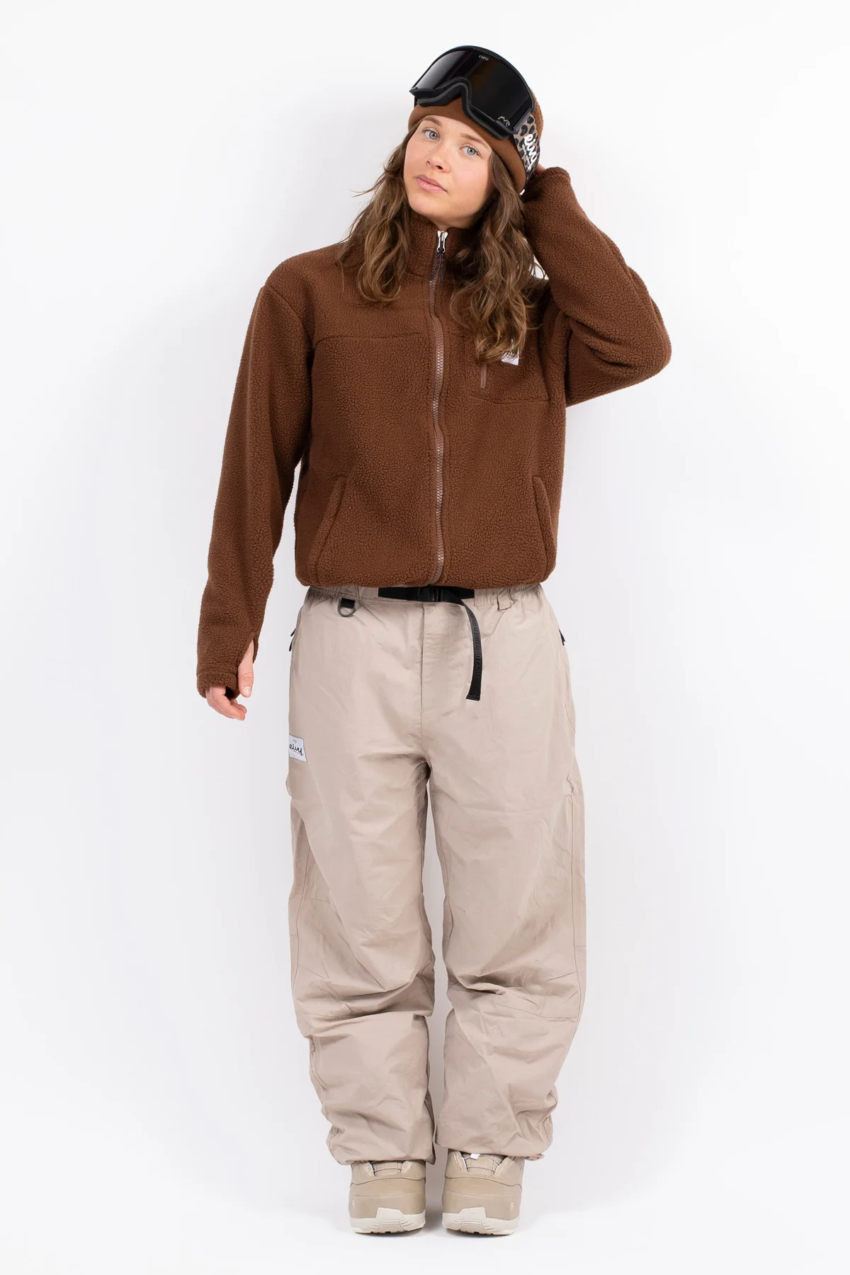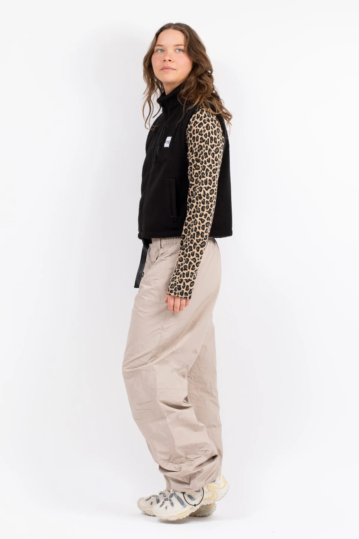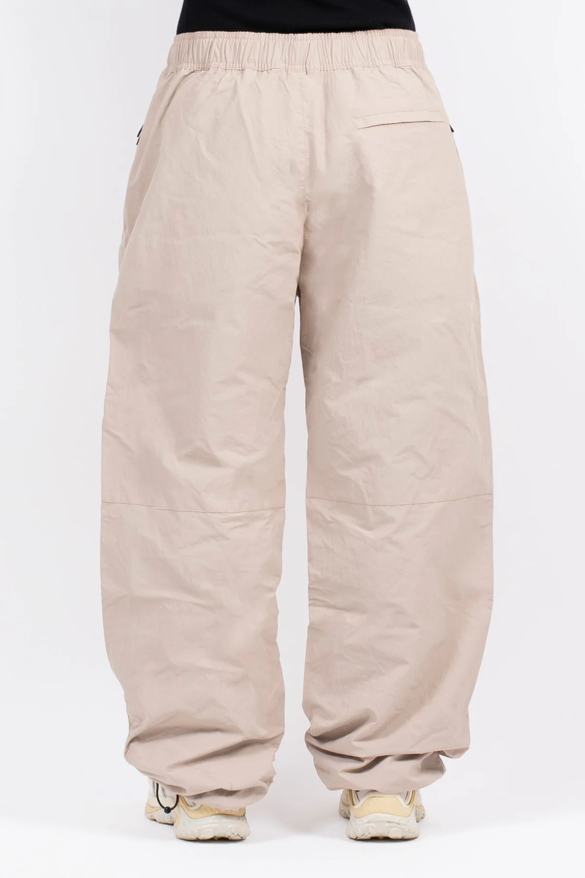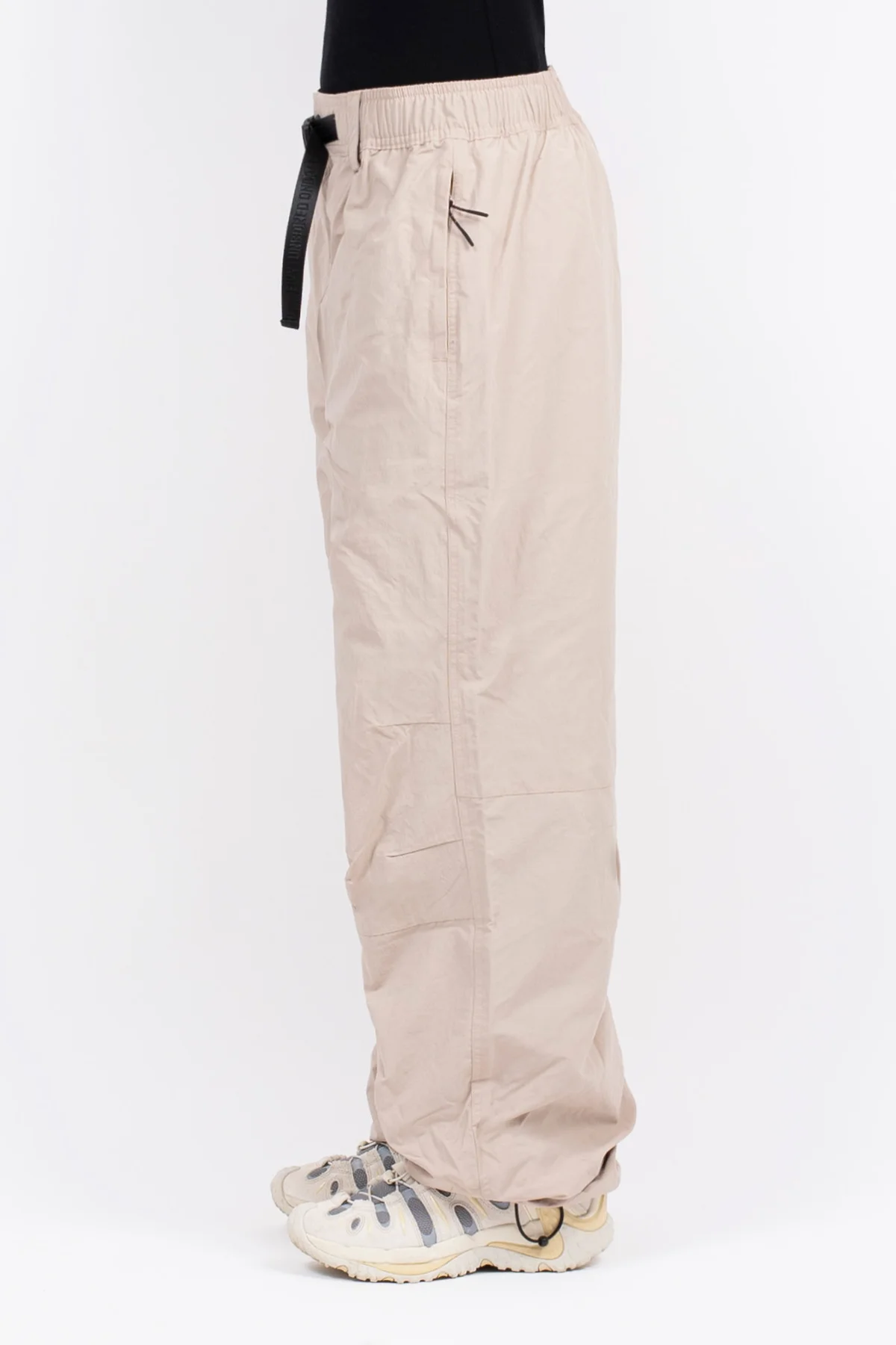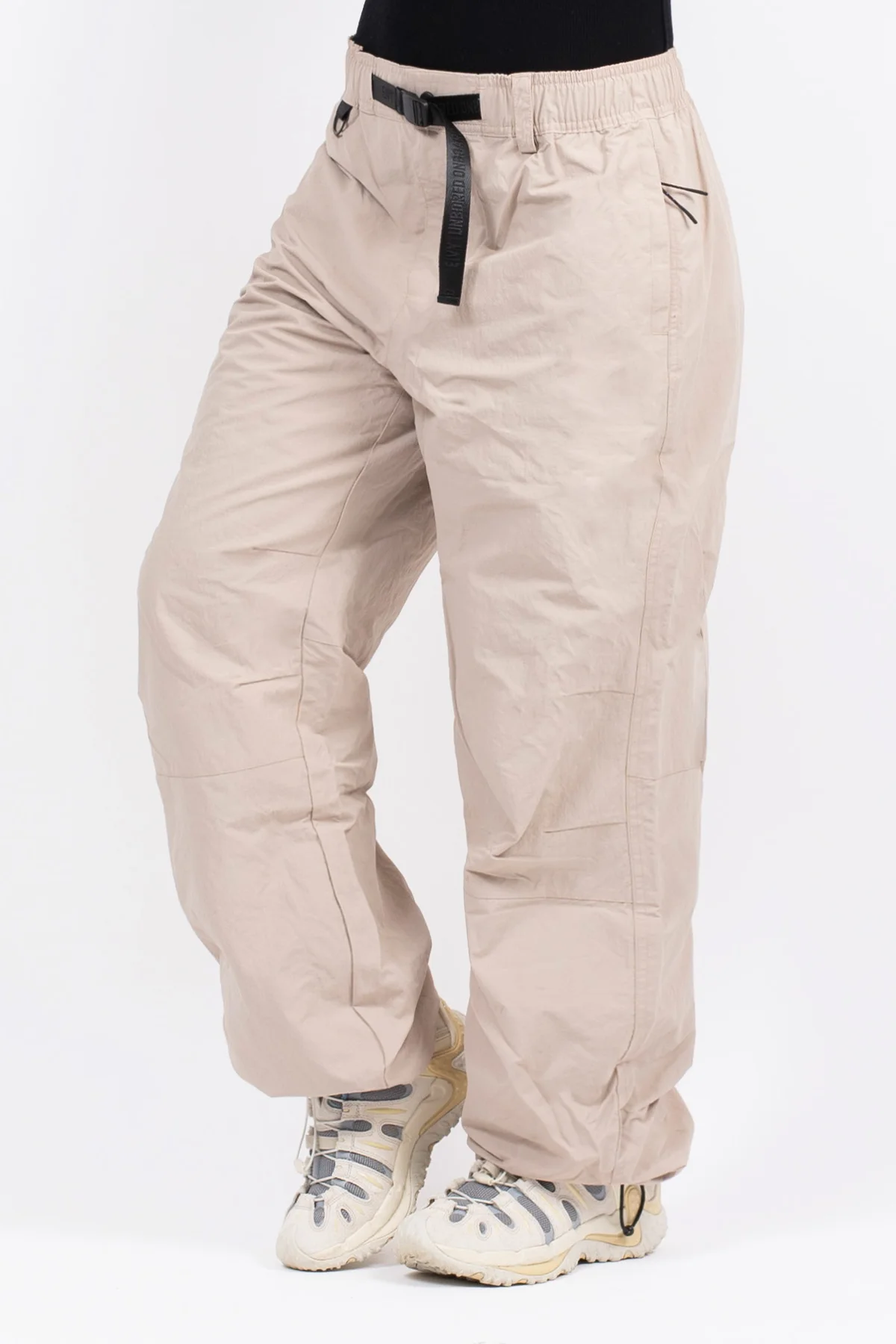 Wind-resistant beige outdoor pants with inside mesh in a lightweight, oversized parachute fit designed for freedom of movement and everyday wear. Featuring zippered front pockets to keep your essentials secure, a small adjustable belt at the waist for a customizable fit, and drawstrings at the leg openings to cinch in or wear loose. Finished with a woven Eivy patch for that signature touch — these are your go-to pants for layering, lounging, or exploring the outdoors in comfort and style.