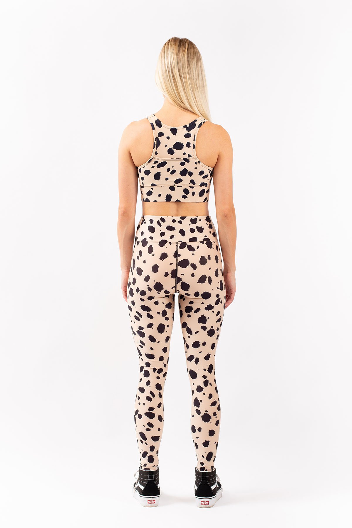 Mountain to the sea where I wanna be – multiFUNctional sports bra in a beige cheetah pattern cut for yoga, surfing, snowboarding, skiing and all good things in between. The flatlock seams prevent chafing and the elastic chest band makes it a comfortable fit. The bra is also equipped with a removable fleece lining for extra warmth and support and an integrated pocket at the back.