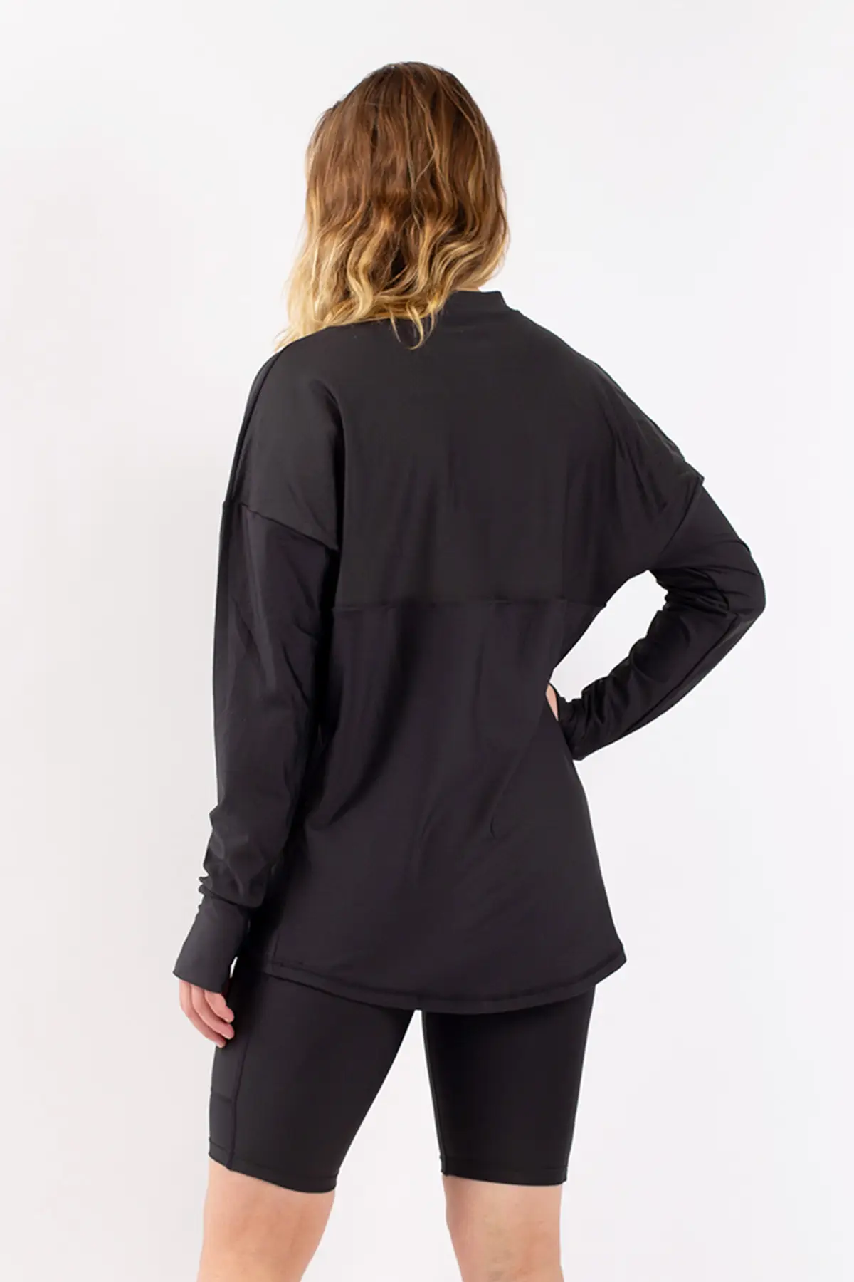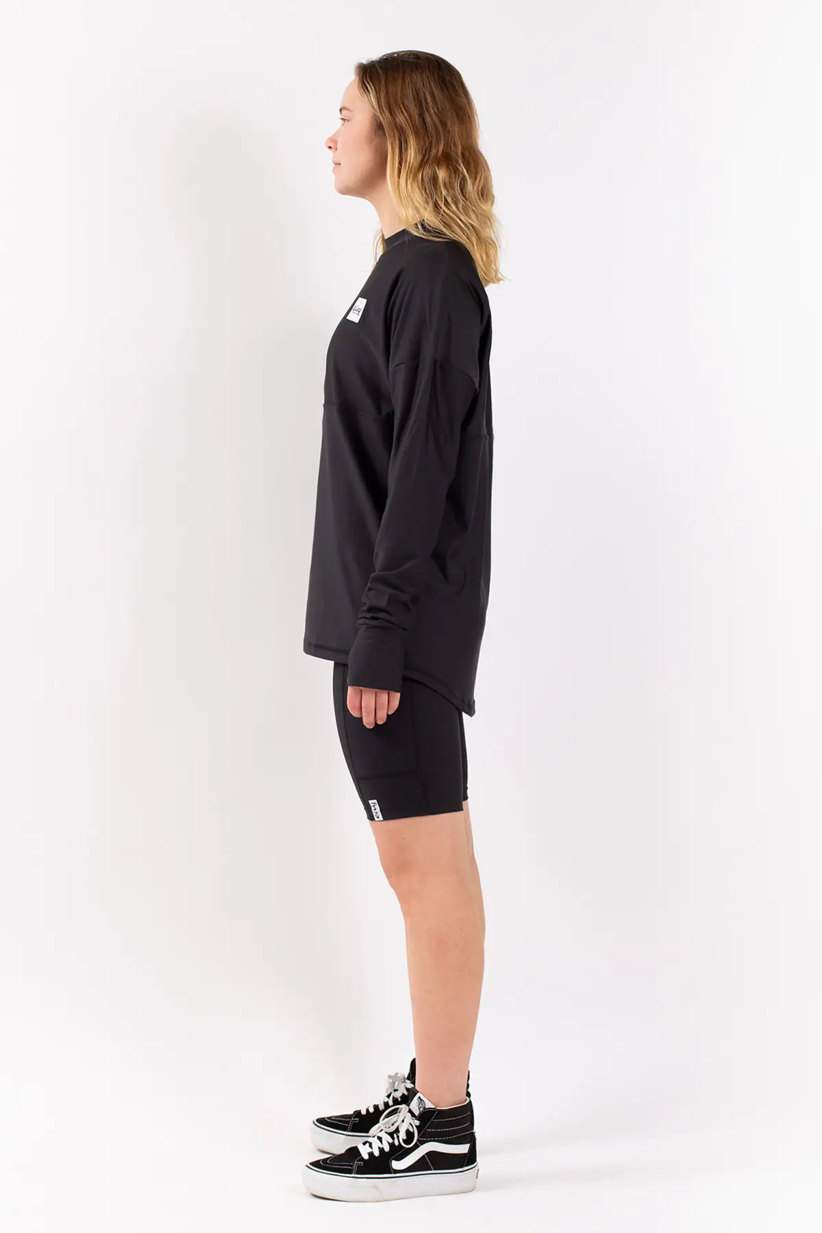 MultiFUNctional longsleeve base layer with a slightly oversized fit, extended back and integrated thumb loops. Developed without a neckwarmer to replace as many garments as possible when you are packing whether it's summer or winter, for snowboarding, skiing, yoga, working out or exploring new countries that's coming up.