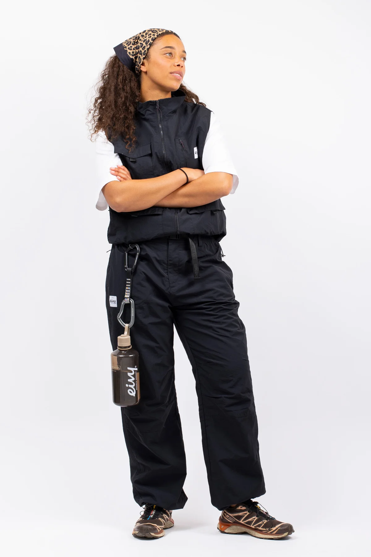 Slightly oversized black outdoor vest with wind-resistant functionality and clean, functional details such as inside mesh. Designed with a high collar for added protection, secure pockets with zippers or buttons to stash your essentials, and with a woven Eivy patch for that signature look. The adjustable drawstring hem lets you wear it straight or tucked for a more fitted silhouette. Perfect as a stylish layer over a hoodie or base layer for everyday adventures or hiking days.
